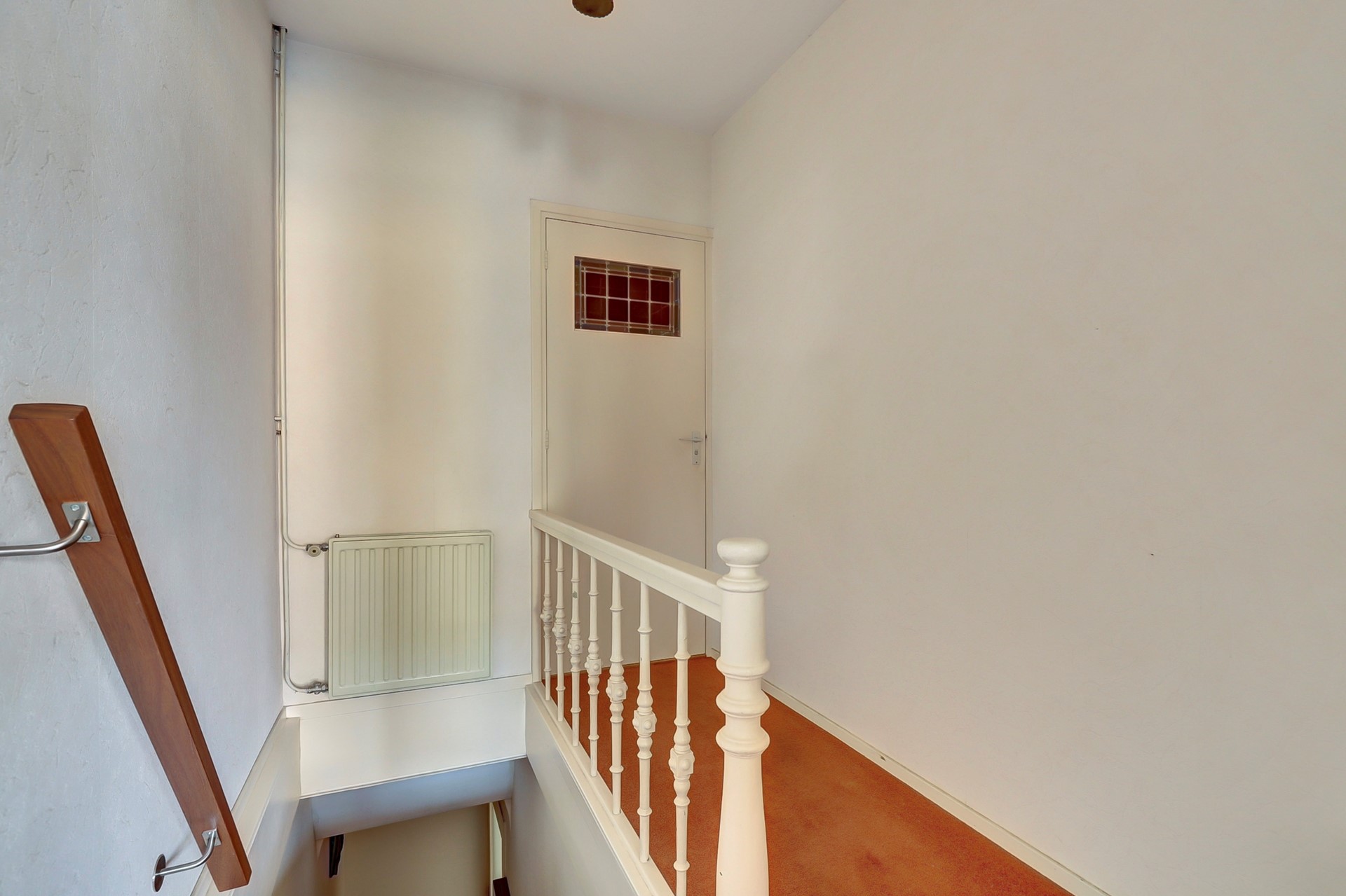 De trap komt uit op de overloop met kastruimte en geeft toegang tot de betegelde badkamer