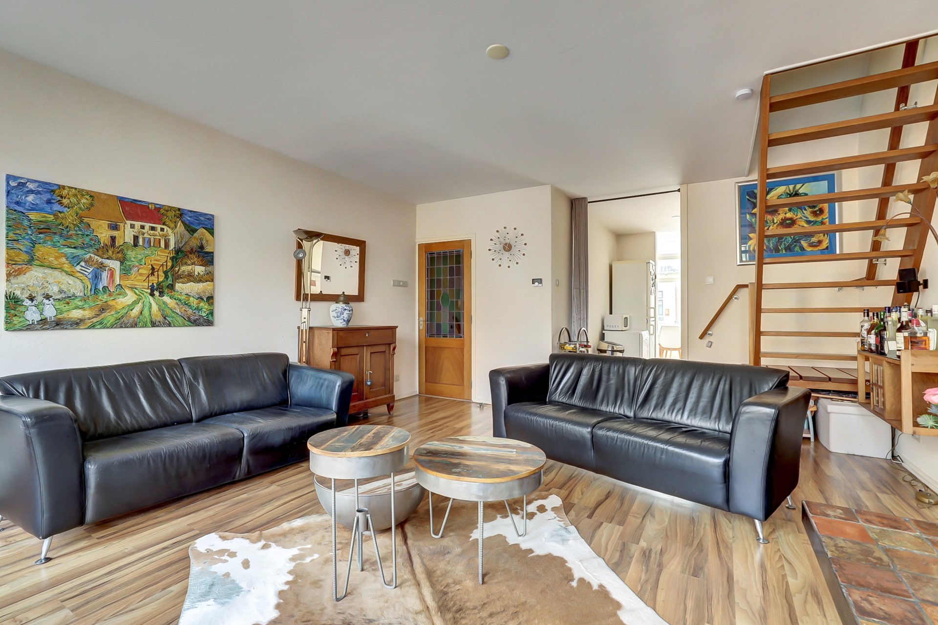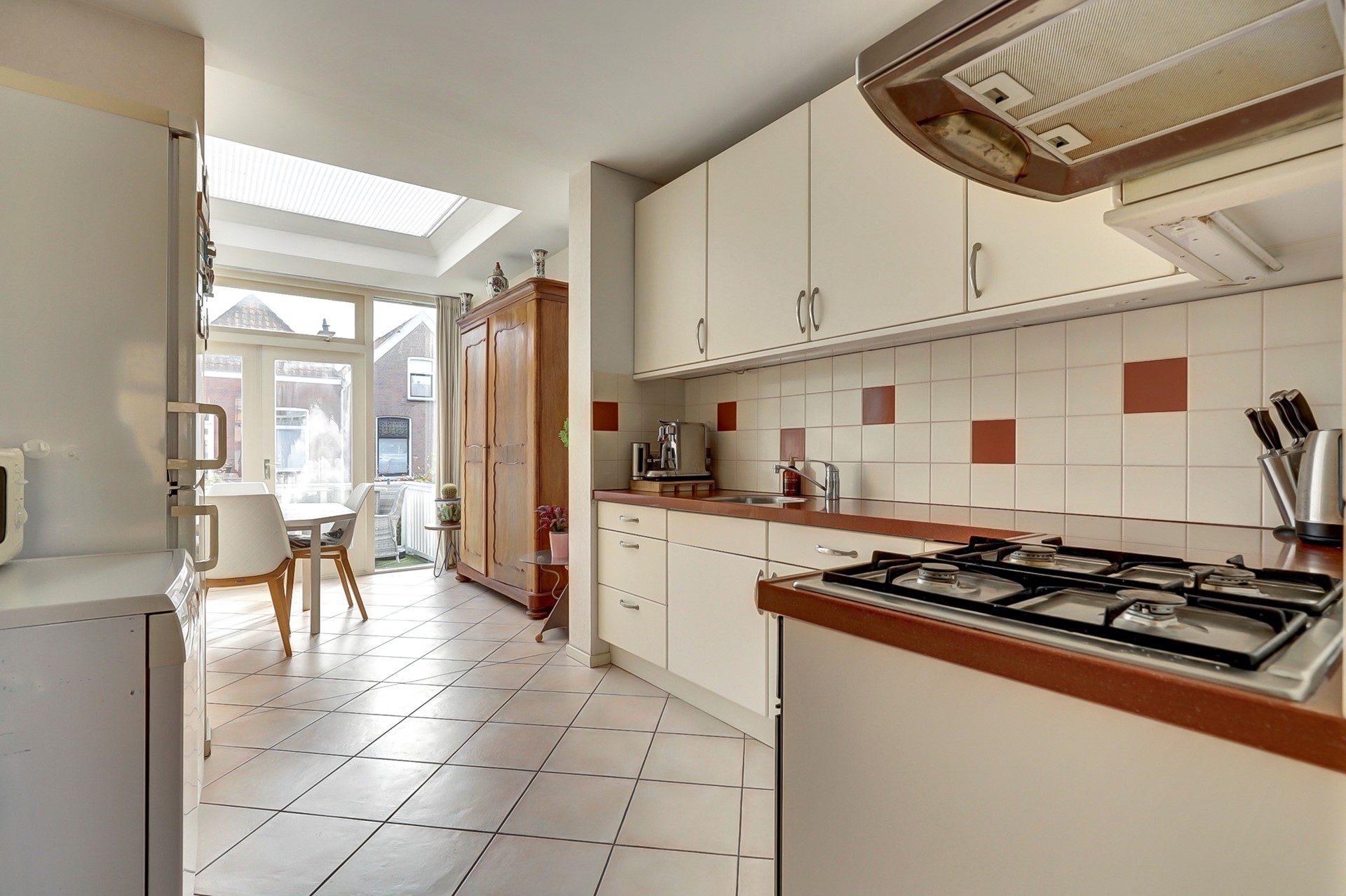 De trap komt uit op de overloop met toegang tot een ruim 2e toilet met opstelplaats van de cv-combiketel en de woonkamer (ca 6,3x4,8m) aan de voorzijde met openhaard en een open trap naar de 2e verdieping. De tussengelegen keuken (ca 2,7x2,9m) heeft een gasfornuis met afzuigkap, afwasmachine, koel/vriescombinatie en geeft toegang tot de achterkamer (ca 3,2x3,6m) met grote dakkoepel en openslaande deuren naar het dakterras (ca 2,6x4,6m).