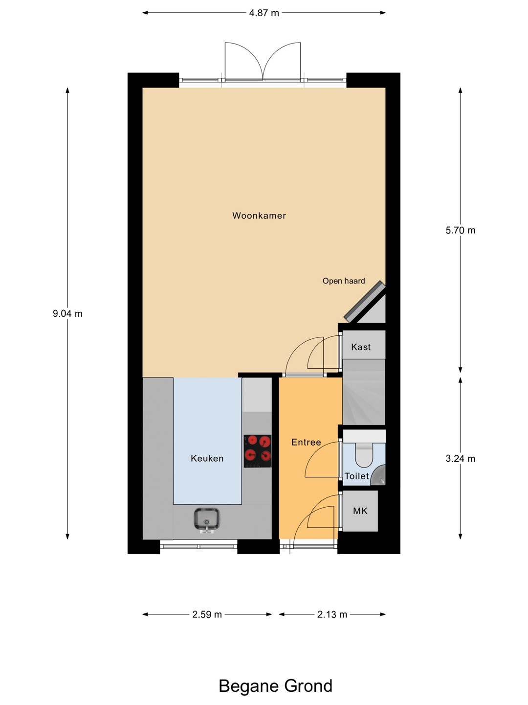 De ruime verzorgde voortuin (ca. 4,2x5,5m) leidt naar de entree van de woning. In de hal bevinden zich de meterkast en een modern betegeld vrij hangend toilet met fontein. De fraaie houten vloerdelen in de hal lopen door in de lichte woonkamer (ca. 5,7x4,9m) met openhaard en trapkast. Aan de voorzijde bevindt zich de open keuken (ca. 3,2x2,6m) met diverse inbouwapparatuur. Aan de achterzijde geven openslaande deuren toegang tot de verzorgde achtertuin (ca. 3,2x2,6m) op het Noordoosten gelegen, met een overkapping, stenen berging (ca. 2,4x2,8m) en achterom.