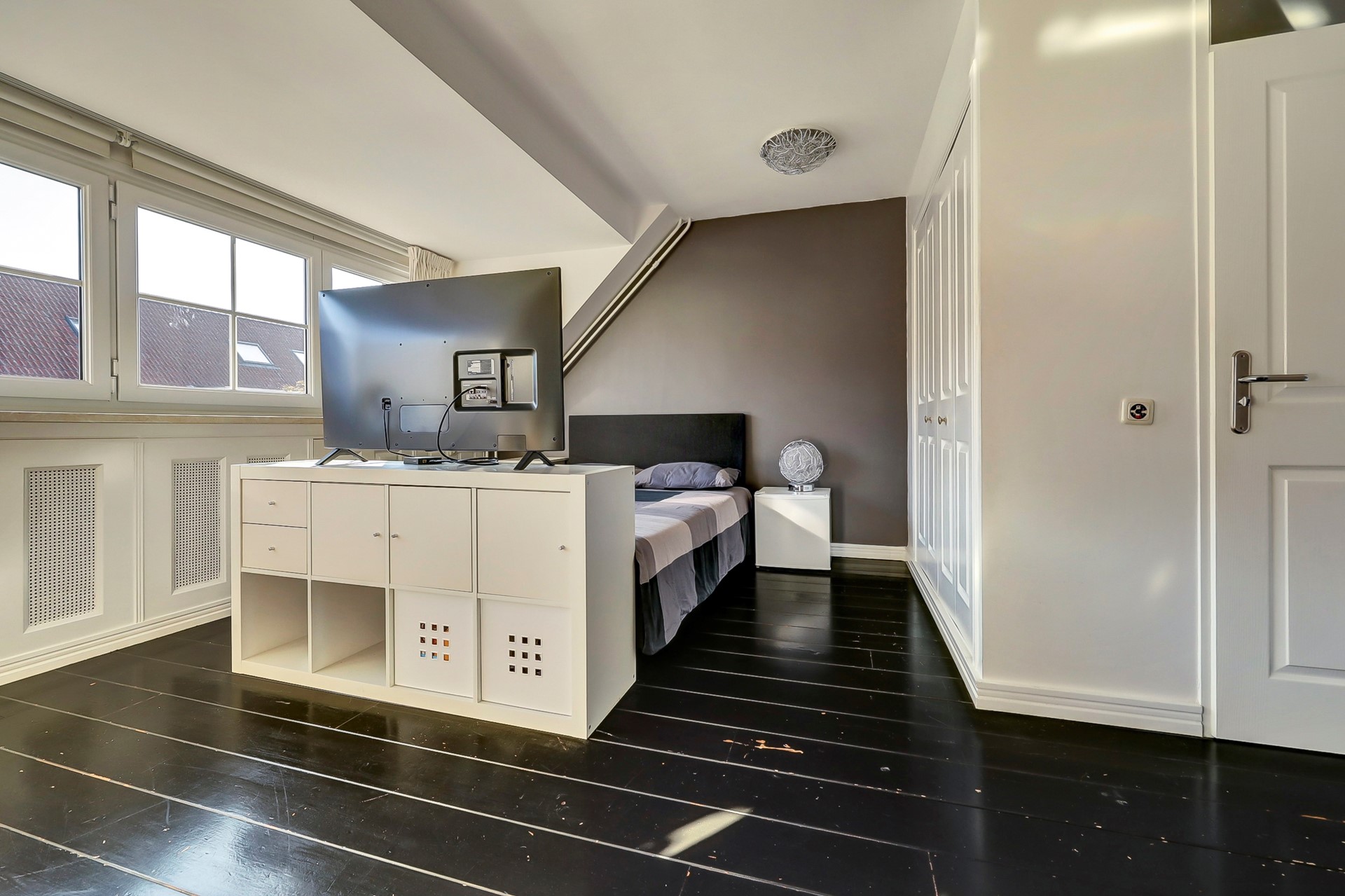 Aan de achterzijde bevindt zich een ruime slaapkamer (ca. 4,9/2,9x4,9), voorheen twee aparte kamers, voorzien van een dakkapel.