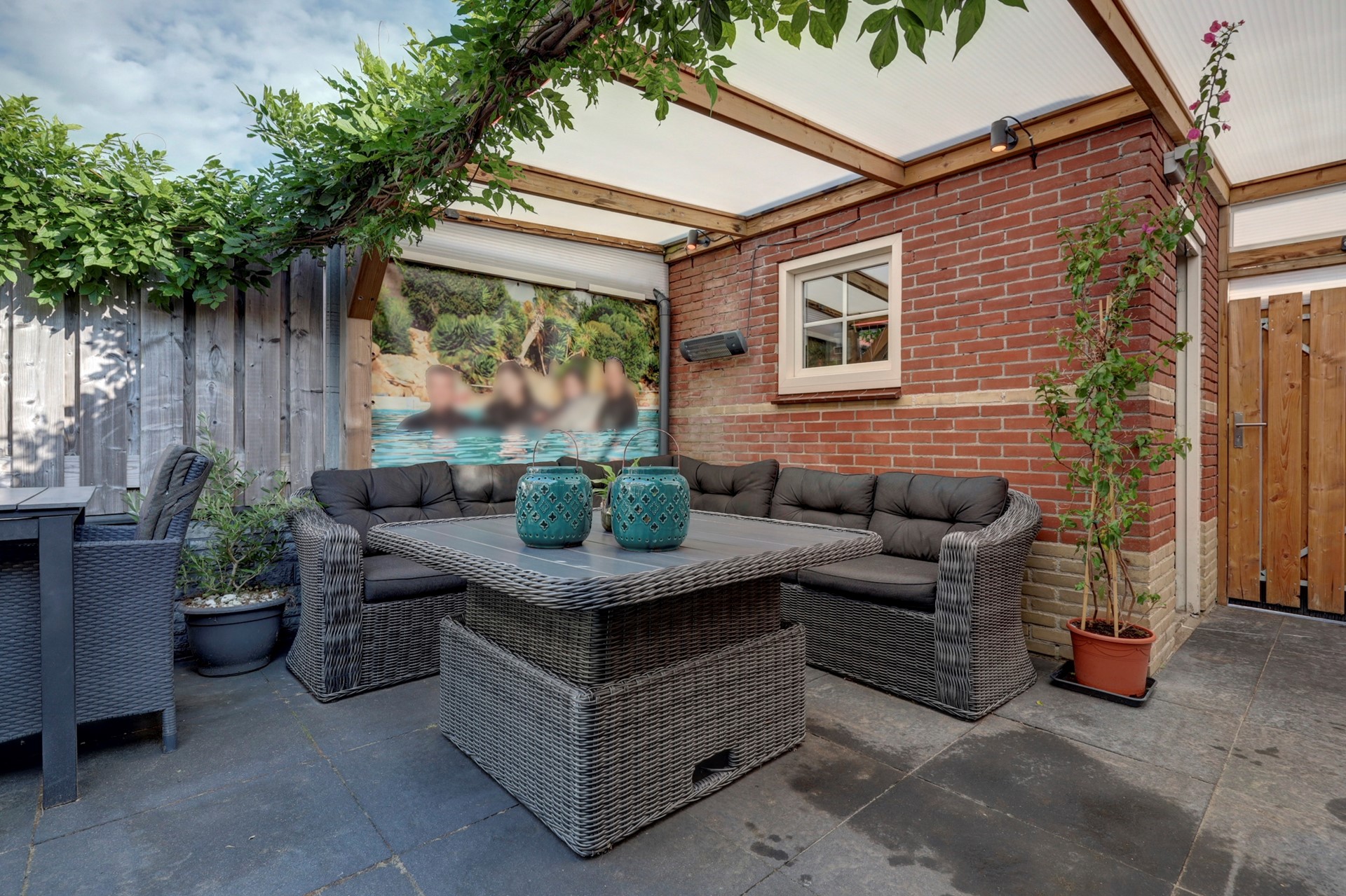 Verzorgde achtertuin (ca. 3,2x2,6m) op het Noordoosten gelegen, met een overkapping, stenen berging (ca. 2,4x2,8m) en achterom.